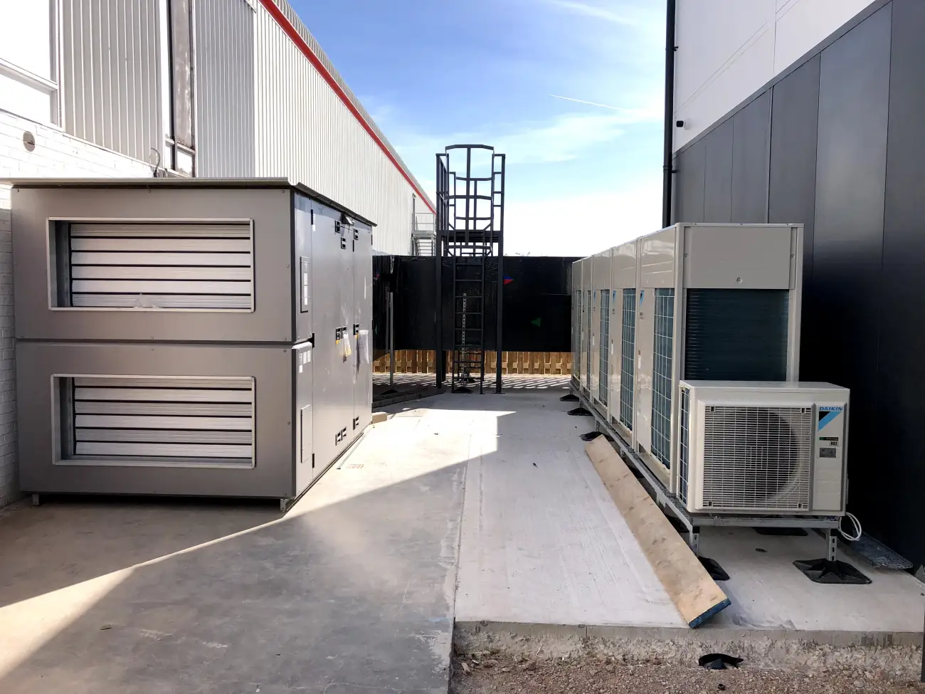 To the first-floor offices, we installed compact ceiling-mounted Daikin VAM heat recovery units, delivering fresh air and energy-efficient heat recovery throughout the space via galvanised steel ductwork and terminal grilles/diffusers. All ductwork was thermally insulated, with external sections fully weather-protected for durability and performance.